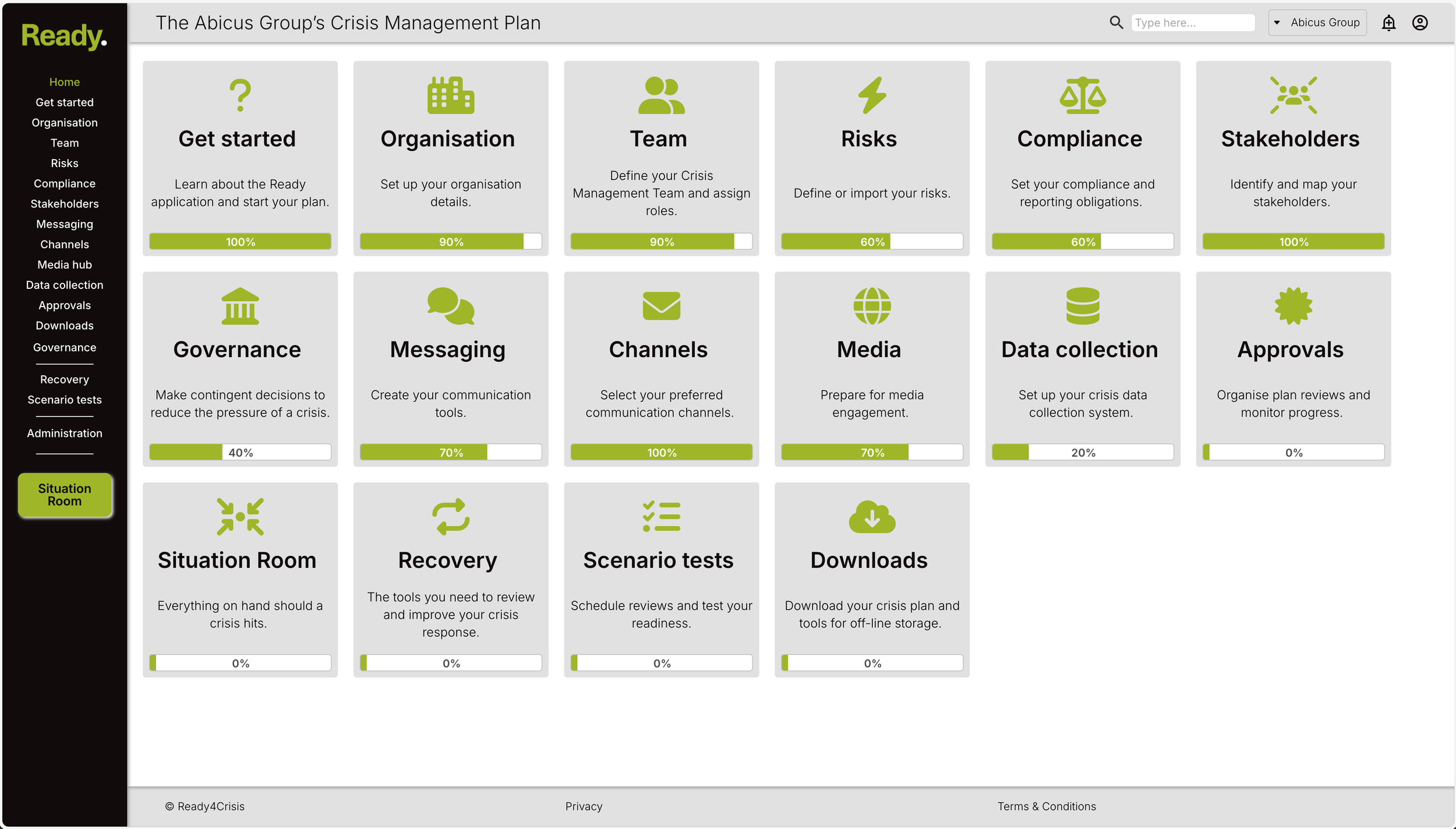 The Ready platform lets you prepare for a crisis and respond when crisis hits. You work through the Readiness modules, making the final downloadable Crisis Response Plan customised to your regulatory regimes, sector and risk maturity.