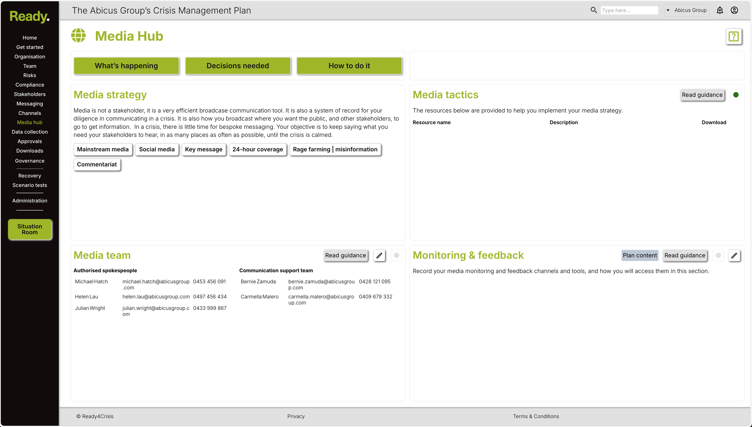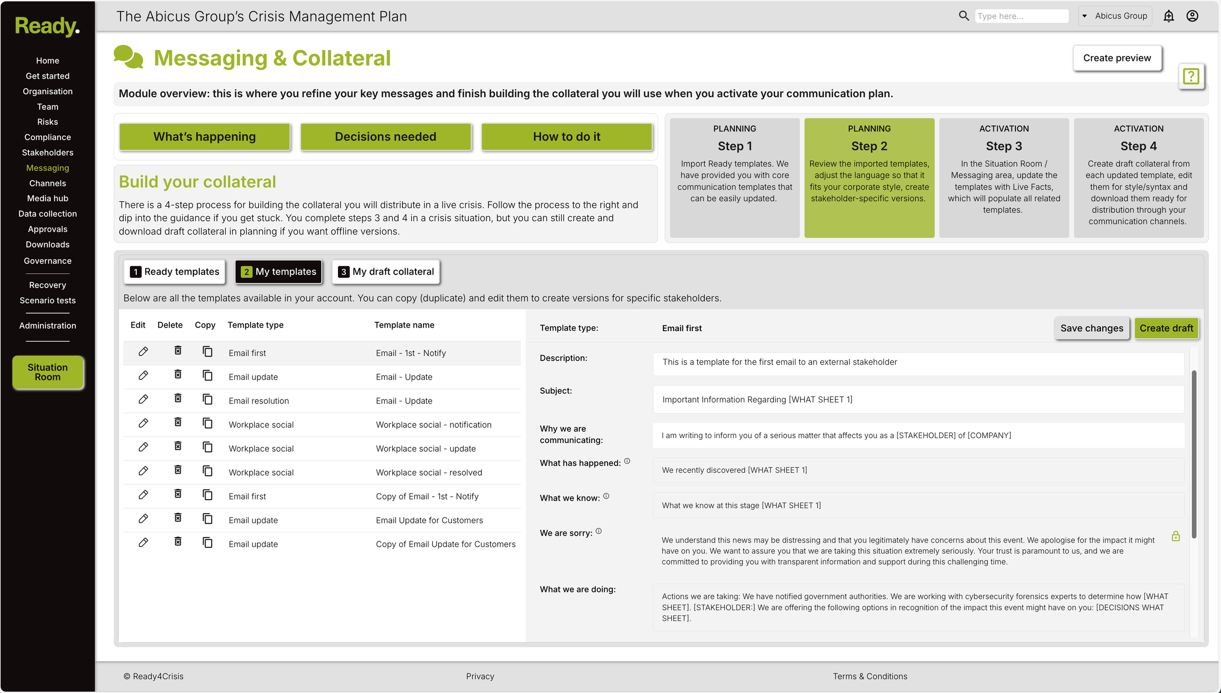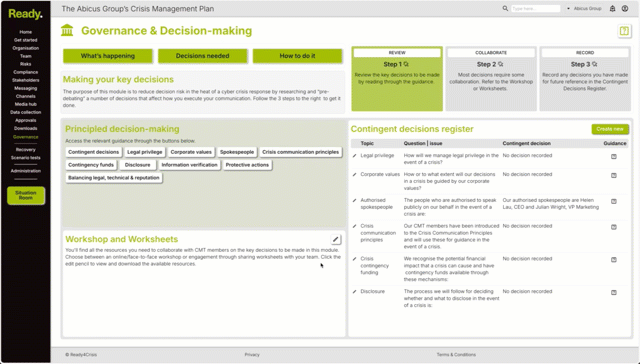 You will basically be able to take Ready for a spin and see if it’s the right fit for your needs. This means you can work through the modules and see how your bespoke crisis response plan is built, how your collateral is assembled and see it all in the Situation Room, ready to Break Glass!