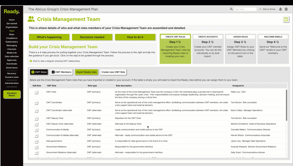 The outputs from working through the modules also populate your bespoke Situation Room, ready for you when an incident escalates to a declared crisis and you stand-up your CMT.